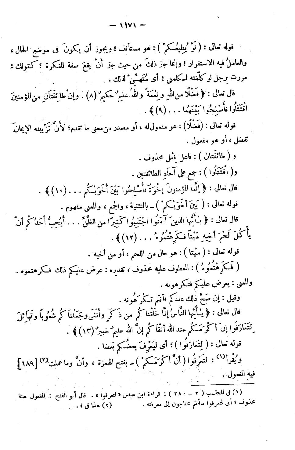 قَوْلُهُ تَعَالَى: (فَضْلًا) : هُوَ مَفْعُولٌ لَهُ، أَوْ مَصْدَرٌ مِنْ مَعْنَى مَا تَقَدَّمَ؛ لِأَنَّ تَزْيِينَهُ الْإِيمَانَ تَفَضُّلٌ، أَوْ هُوَ مَفْعُولٌ. وَ (طَائِفَتَانِ) : فَاعِلُ فِعْلٍ مَحْذُوفٍ. وَ (اقْتَتَلُوا) : جَمْعٌ عَلَى آحَادِ الطَّائِفَتَيْنِ.