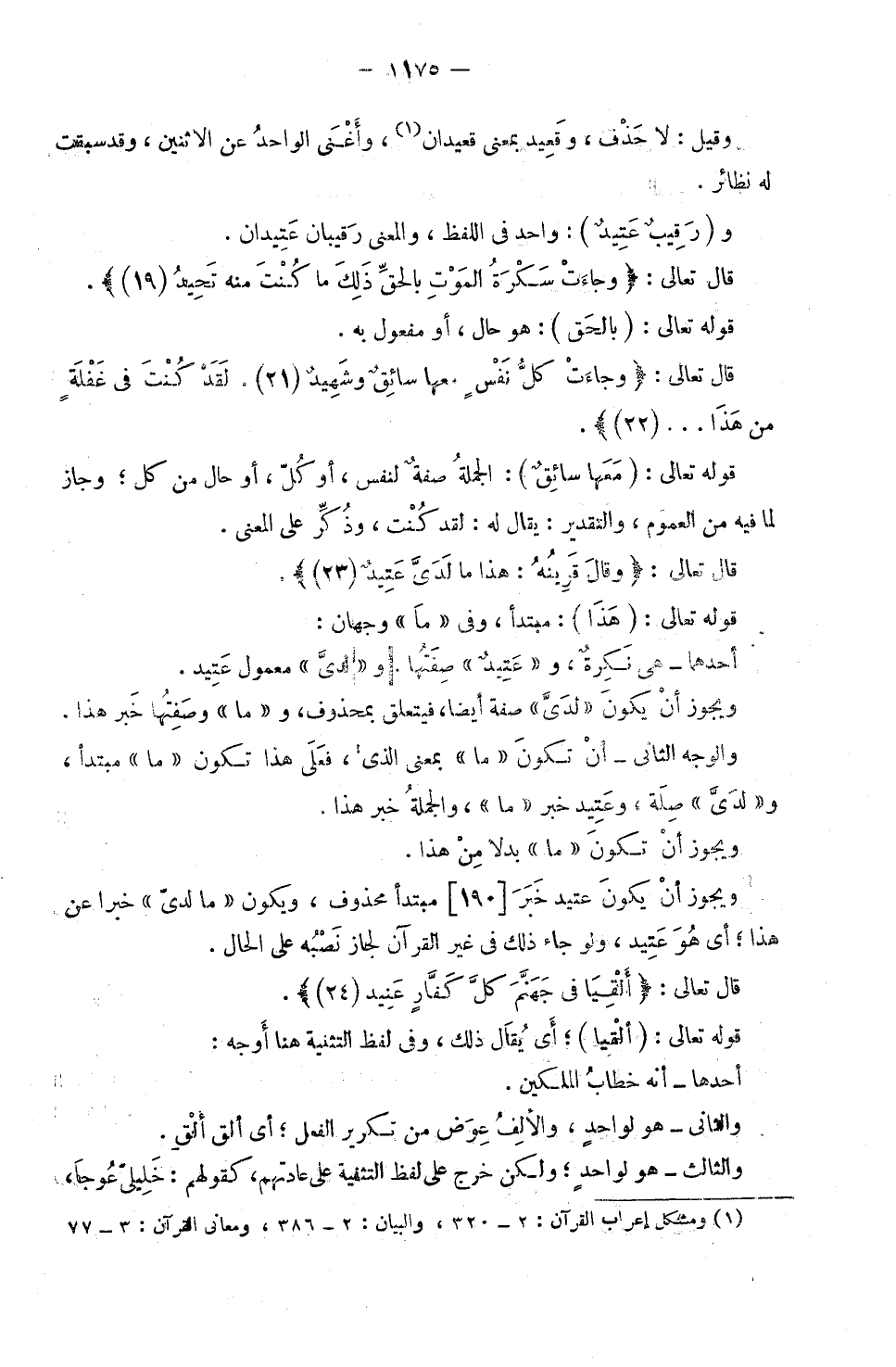 وَقِيلَ: لَا حَذْفَ، وَقَعِيدٌ بِمَعْنَى قَعِيدَانِ، وَأَغْنَى الْوَاحِدُ عَنْ الِاثْنَيْنِ، وَقَدْ سَبَقَتْ لَهُ نَظَائِرُ. وَ (رَقِيبٌ عَتِيدٌ) : وَاحِدٌ فِي اللَّفْظِ، وَالْمَعْنَى: رَقِيبَانِ عَتِيدَانِ.