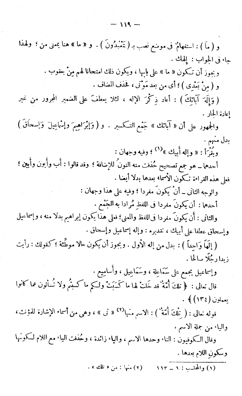 وَالثَّانِي: أَنْ يَكُونَ مُفْرَدًا فِي اللَّفْظِ وَالْمَعْنَى ; فَعَلَى هَذَا يَكُونُ إِبْرَاهِيمُ بَدَلًا مِنْهُ، وَإِسْمَاعِيلُ وَإِسْحَاقُ عَطْفًا عَلَى أَبِيكَ، تَقْدِيرُهُ: وَإِلَهُ إِسْمَاعِيلَ وَإِسْحَاقَ.