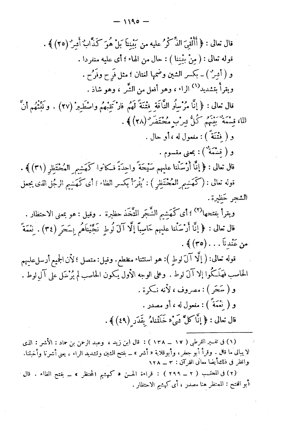 قَوْلُهُ تَعَالَى: (إِلَّا آلَ لُوطٍ) : هُوَ اسْتِثْنَاءٌ مُنْقَطِعٌ. وَقِيلَ: مُتَّصِلٌ؛ لِأَنَّ الْجَمِيعَ أُرْسِلَ عَلَيْهِمُ الْحَاصِبُ فَهَلَكُوا إِلَّا آلَ لُوطٍ. وَعَلَى الْوَجْهِ الْأَوَّلِ يَكُونُ الْحَاصِبُ لَمْ يُرْسَلْ عَلَى آلِ لُوطٍ. وَ (سَحَرٍ) : مَصْرُوفٌ، لِأَنَّهُ نَكِرَةٌ. وَ (نِعْمَةً) : مَفْعُولٌ لَهُ، أَوْ مَصْدَرٌ.