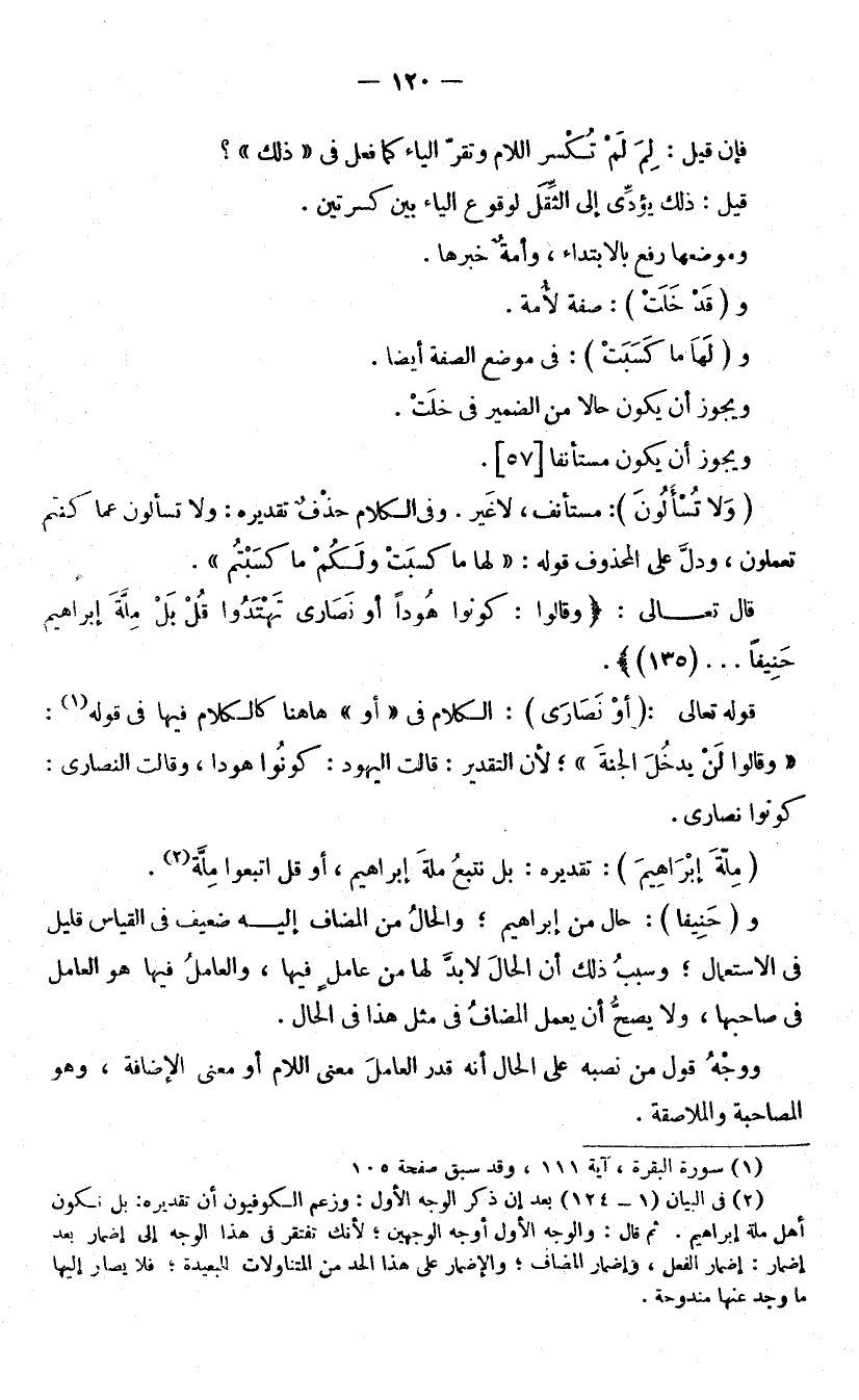 (وَقَالُوا لَنْ يَدْخُلَ الْجَنَّةَ) [الْبَقَرَةِ: 111] ; لِأَنَّ التَّقْدِيرَ: قَالَتِ الْيَهُودُ كُونُوا هُودًا، وَقَالَتِ النَّصَارَى كُونُوا نَصَارَى. (مِلَّةَ إِبْرَاهِيمَ) : تَقْدِيرُهُ: بَلْ نَتَّبِعُ مِلَّةَ إِبْرَاهِيمَ، أَوْ قُلِ اتَّبِعُوا مِلَّةَ.