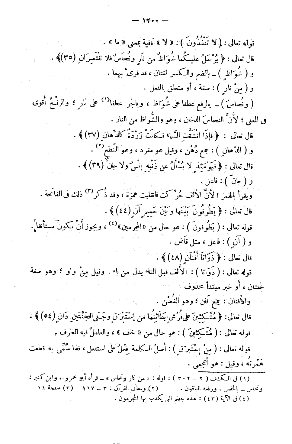 (وَنُحَاسٌ) بِالرَّفْعِ عَطْفًا عَلَى شُوَاظٍ، وَبِالْجَرِّ عَطْفًا عَلَى نَارٍ؛ وَالرَّفْعُ أَقْوَى فِي الْمَعْنَى؛ لِأَنَّ النُّحَاسَ: الدُّخَانُ، وَهُوَ الشُّوَاظُ مِنَ النَّارِ.