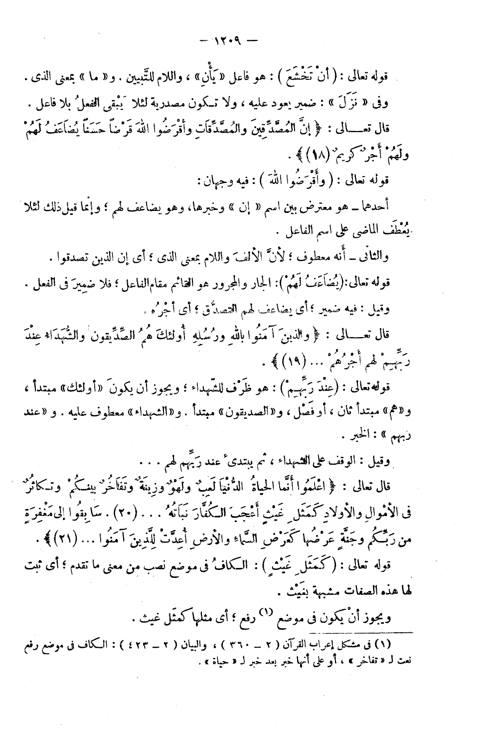قَوْلُهُ تَعَالَى: (أَنْ تَخْشَعَ) : هُوَ فَاعِلُ «يَأْنِ» ، وَاللَّامُ لِلتَّبْيِينِ. وَ «مَا» بِمَعْنَى الَّذِي، وَفِي «نَزَلَ» ضَمِيرٌ يَعُودُ عَلَيْهِ، وَلَا تَكُونُ مَصْدَرِيَّةً لِئَلَّا يَبْقَى الْفِعْلُ بِلَا فَاعِلٍ.