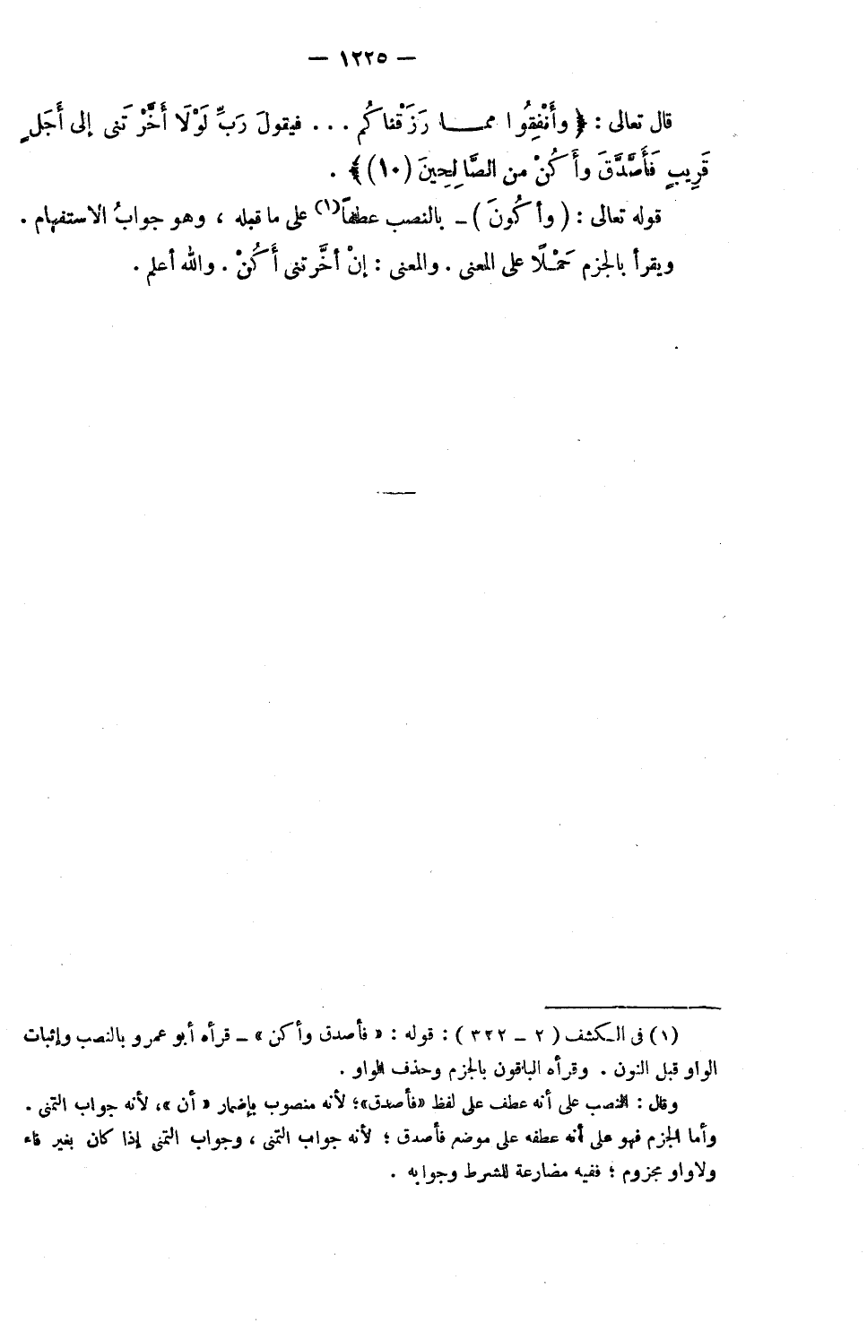 قَوْلُهُ تَعَالَى: (وَأَكُونَ) : بِالنَّصْبِ عَطْفًا عَلَى مَا قَبْلَهُ، وَهُوَ جَوَابُ الِاسْتِفْهَامِ. وَيُقْرَأُ بِالْجَزْمِ حَمْلًا عَلَى الْمَعْنَى. وَالْمَعْنَى: إِنْ أَخَّرْتَنِي أَكُنْ. وَاللَّهُ أَعْلَمُ.