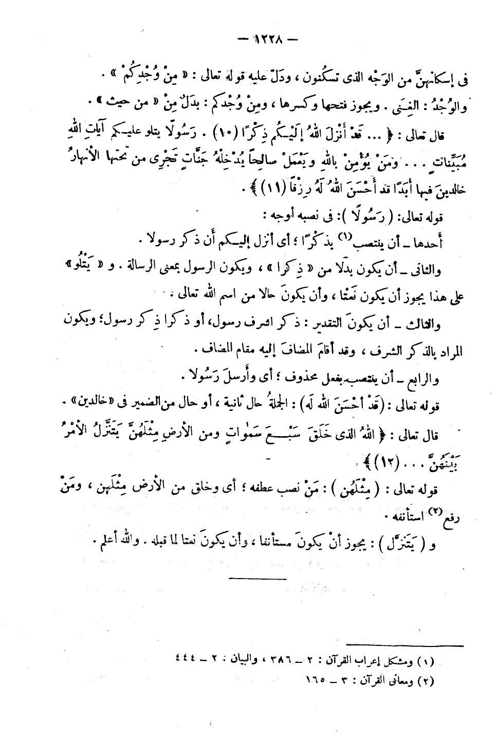 وَالثَّانِي: أَنْ يَكُونَ بَدَلًا مِنْ «ذِكْرًا» وَيَكُونَ الرَّسُولُ بِمَعْنَى الرِّسَالَةِ. وَ «يَتْلُو» عَلَى هَذَا يَجُوزُ أَنْ يَكُونَ نَعْتًا، وَأَنْ يَكُونَ حَالًا مِنِ اسْمِ اللَّهِ تَعَالَى.