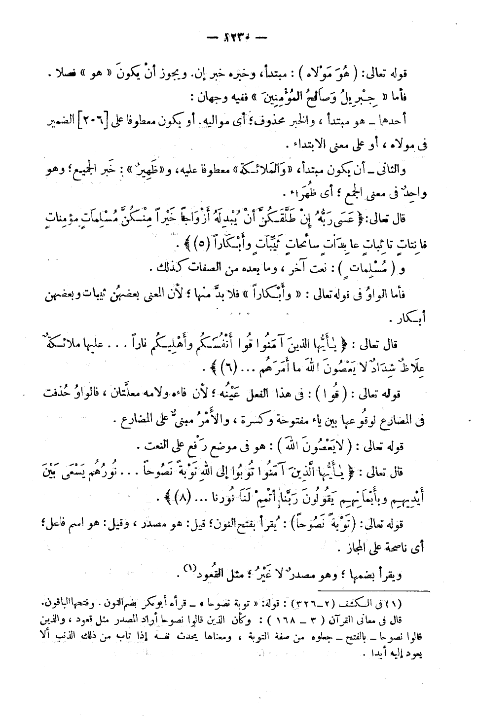 قَوْلُهُ تَعَالَى: (تَوْبَةً نَصُوحًا) : يُقْرَأُ بِفَتْحِ النُّونِ؛ قِيلَ: هُوَ مَصْدَرٌ، وَقِيلَ: هُوَ اسْمُ فَاعِلٍ؛ أَيْ نَاصِحَةً؛ عَلَى الْمَجَازِ. وَيُقْرَأُ بِضَمِّهَا؛ وَهُوَ مَصْدَرٌ لَا غَيْرَ؛ مِثْلُ الْقُعُودِ.