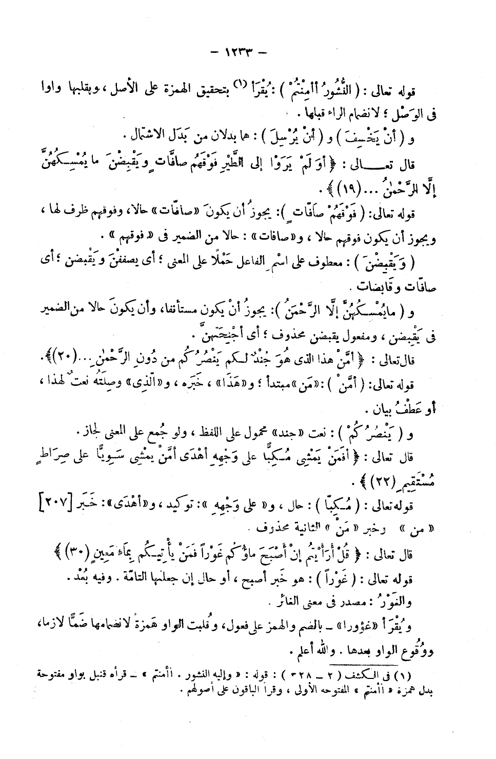 قَوْلُهُ تَعَالَى: (فَوْقَهُمْ صَافَّاتٍ) : يَجُوزُ أَنْ يَكُونَ «صَافَّاتٍ» حَالًا، وَ «فَوْقَهُمْ» ظَرْفٌ لَهَا، وَيَجُوزُ أَنْ يَكُونَ «فَوْقَهُمْ» حَالًا، وَ «صَافَّاتٍ» : حَالًا مِنَ الضَّمِيرِ فِي «فَوْقَهُمْ» .