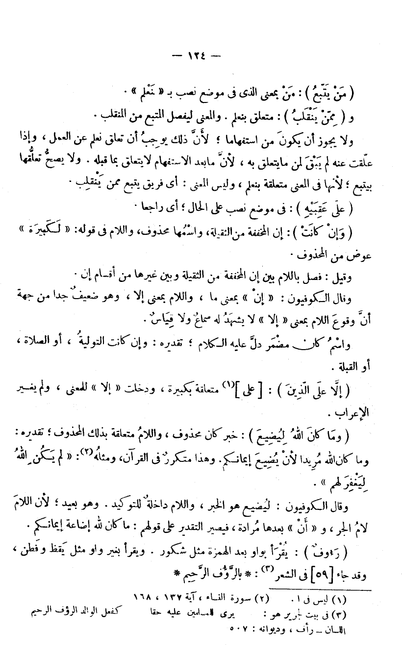 (إِلَّا عَلَى الَّذِينَ) : (عَلَى) مُتَعَلِّقَةٌ بِكَبِيرَةٍ وَدَخَلَتْ إِلَّا لِلْمَعْنَى وَلَمْ يُغَيَّرِ الْإِعْرَابُ. (وَمَا كَانَ اللَّهُ لِيُضِيعَ) : خَبَرُ كَانَ مَحْذُوفٌ، وَاللَّامُ مُتَعَلِّقَةٌ بِذَلِكَ الْمَحْذُوفِ تَقْدِيرُهُ: وَمَا كَانَ اللَّهُ مُرِيدًا لِأَنْ يُضِيعُ إِيمَانَكُمْ، وَهَذَا مُتَكَرِّرٌ فِي الْقُرْآنِ، وَمِثْلُهُ: (لَمْ يَكُنِ اللَّهُ لِيَغْفِرَ لَهُمْ) [النِّسَاءِ: 137] . وَقَالَ الْكُوفِيُّونَ: لِيُضِيعَ هُوَ الْخَبَرُ، وَاللَّامُ دَاخِلَةٌ لِلتَّوْكِيدِ، وَهُوَ بَعِيدٌ ; لِأَنَّ اللَّامَ لَامُ الْجَرِّ، وَأَنَّ بَعْدَهَا مُرَادَةٌ، فَيَصِيرُ التَّقْدِيرُ عَلَى قَوْلِهِمْ مَا كَانَ لِلَّهِ إِضَاعَةُ إِيمَانِكُمْ.