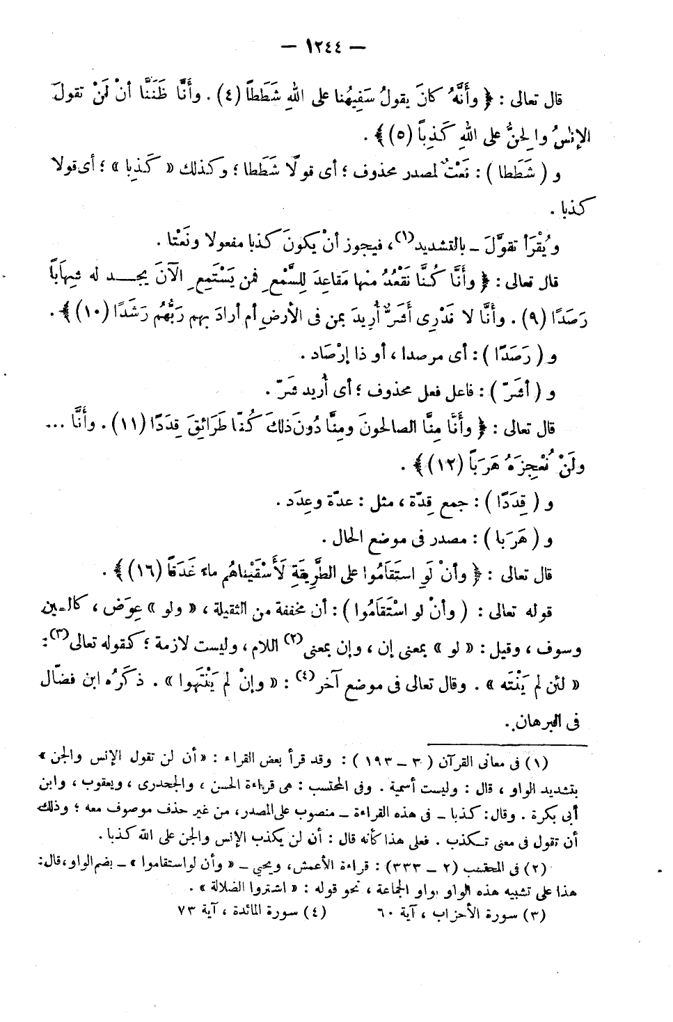 (شَطَطًا) : نَعْتٌ لِمَصْدَرٍ مَحْذُوفٍ؛ أَيْ قَوْلًا شَطَطًا؛ وَكَذَلِكَ «كَذِبًا» أَيْ قَوْلًا كَذِبًا.