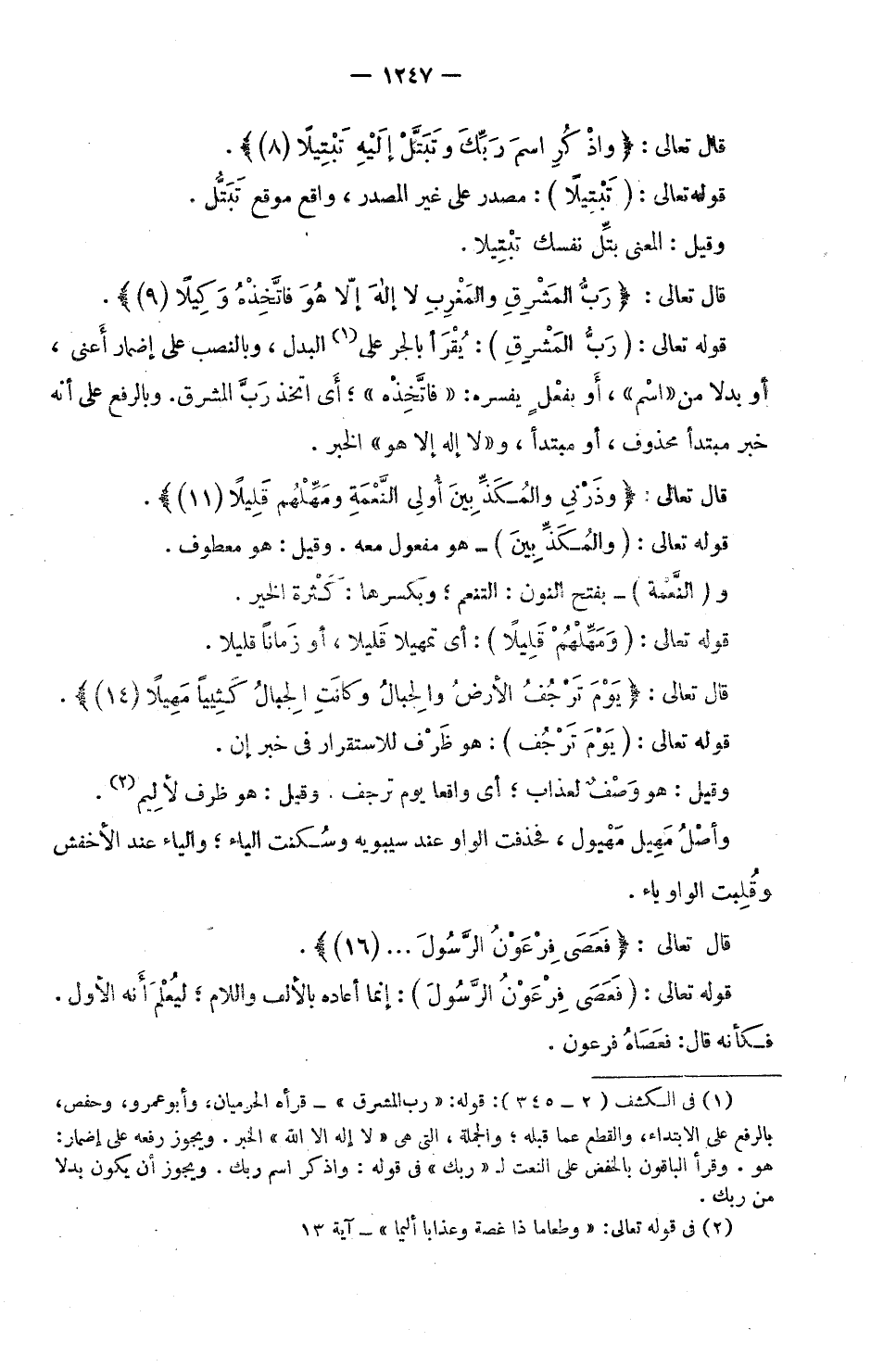 قَوْلُهُ تَعَالَى: (تَبْتِيلًا) : مَصْدَرٌ عَلَى غَيْرِ الْمَصْدَرِ، وَاقِعٌ مَوْضِعَ تَبَتُّلٍ.