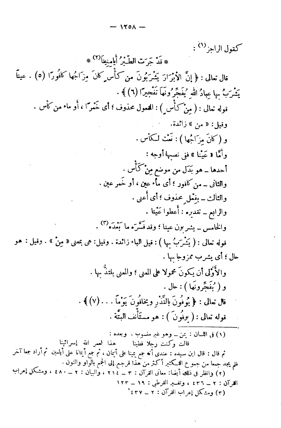 وَقِيلَ: «مِنْ» زَائِدَةٌ. وَ (كَانَ مِزَاجُهَا) : نَعْتٌ لِكَأْسٍ. وَأَمَّا «عَيْنًا» فَفِي نَصْبِهَا أَوْجُهٌ؛ أَحَدُهَا: هُوَ بَدَلٌ مِنْ مَوْضِعِ مِنْ كَأْسٍ. وَالثَّانِي: مِنْ كَافُورٍ؛ أَيْ مَاءَ عَيْنٍ، أَوْ خَمْرَ عَيْنٍ. وَالثَّالِثُ: بِفِعْلٍ مَحْذُوفٍ؛ أَيْ أَعْنِي. وَالرَّابِعُ: تَقْدِيرُهُ: أُعْطُوا عَيْنًا. وَالْخَامِسُ: يَشْرَبُونَ