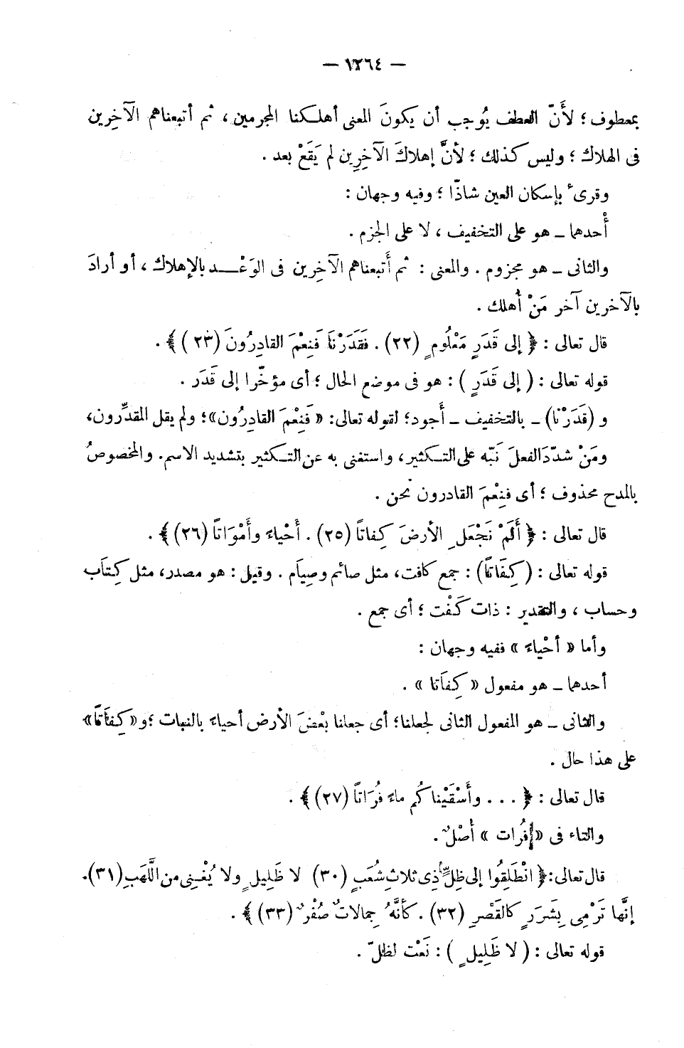 قَوْلُهُ تَعَالَى: (كِفَاتًا) : جَمْعُ كَافِتٍ، مِثْلُ صَائِمٍ وَصِيَامٍ. وَقِيلَ: هُوَ مَصْدَرٌ، مِثْلُ كِتَابٍ وَحِسَابٍ، وَالتَّقْدِيرُ: ذَاتُ كَفْتٍ؛ أَيْ جَمْعٍ. وَأَمَّا «أَحْيَاءً» فَفِيهِ وَجْهَانِ؛ أَحَدُهُمَا: هُوَ مَفْعُولُ «كِفَاتًا» .