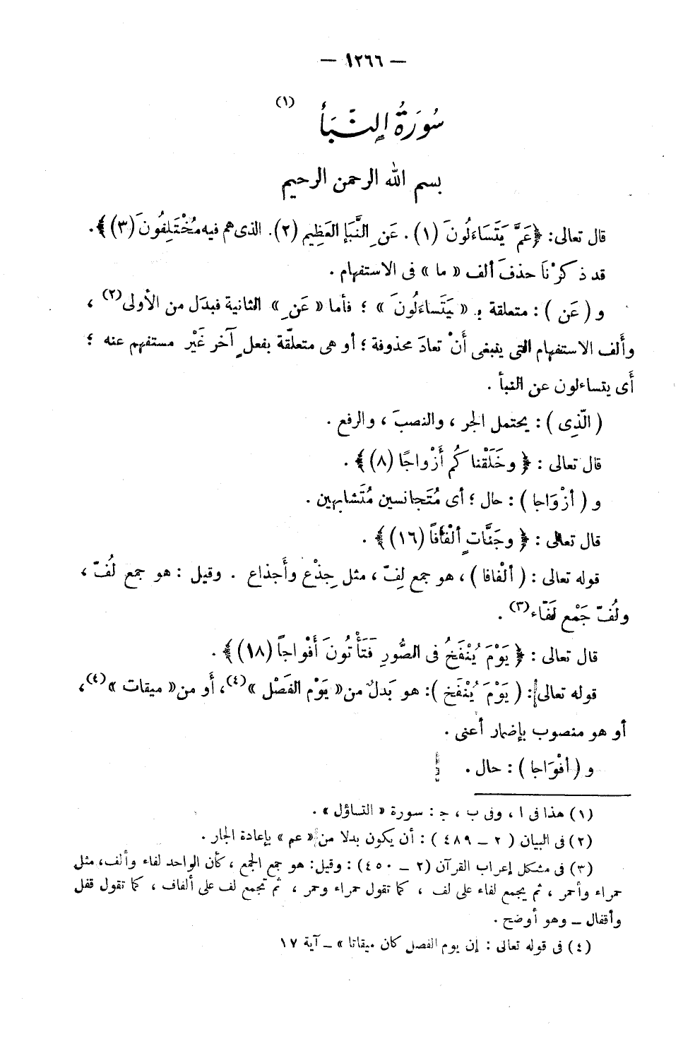 وَ (عَنْ) : مُتَعَلِّقَةٌ بِـ «يَتَسَاءَلُونَ» فَأَمَّا «عَنْ» الثَّانِيَةُ فَبَدَلٌ مِنَ الْأُولَى، وَأَلِفُ الِاسْتِفْهَامِ الَّتِي يَنْبَغِي أَنْ تُعَادَ مَحْذُوفَةٌ؛ أَوْ هِيَ مُتَعَلِّقَةٌ بِفِعْلٍ آخَرَ غَيْرِ مُسْتَفْهَمٍ عَنْهُ؛ أَيْ يَتَسَاءَلُونَ عَنِ النَّبَأِ. (الَّذِي) : يَحْتَمِلُ الْجَرَّ، وَالنَّصْبَ، وَالرَّفْعَ.
