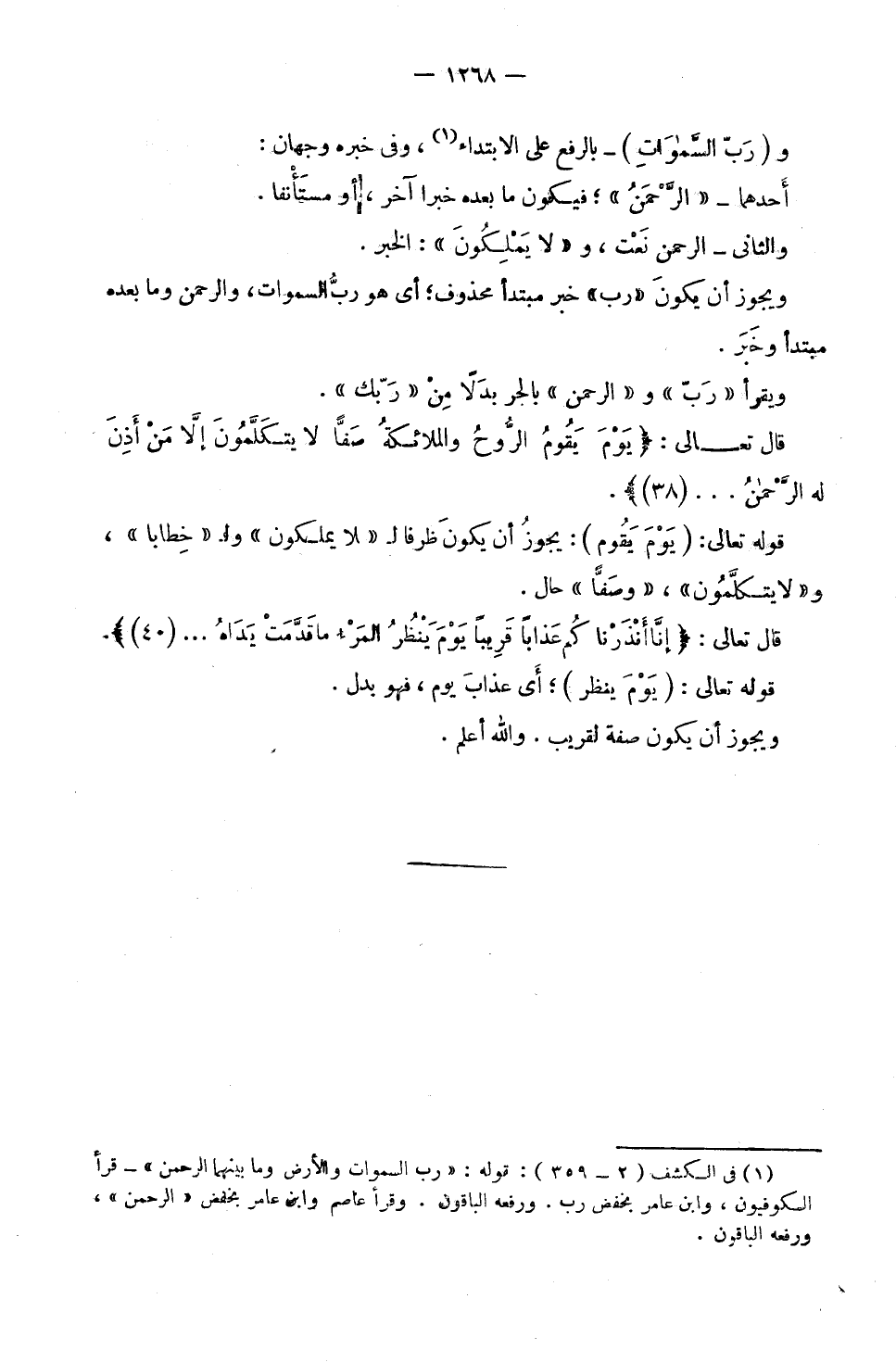 وَيَجُوزُ أَنْ يَكُونَ «رَبُّ» خَبِّرَ مُبْتَدَأٍ مَحْذُوفٍ؛ أَيْ هُوَ رَبُّ السَّمَاوَاتِ، وَ «الرَّحْمَنُ» وَمَا بَعْدَهُ مُبْتَدَأٌ وَخَبَرٌ. وَيُقْرَأُ «رَبِّ» وَ «الرَّحْمَنِ» بِالْجَرِّ بَدَلًا مِنْ «رَبِّكَ» .