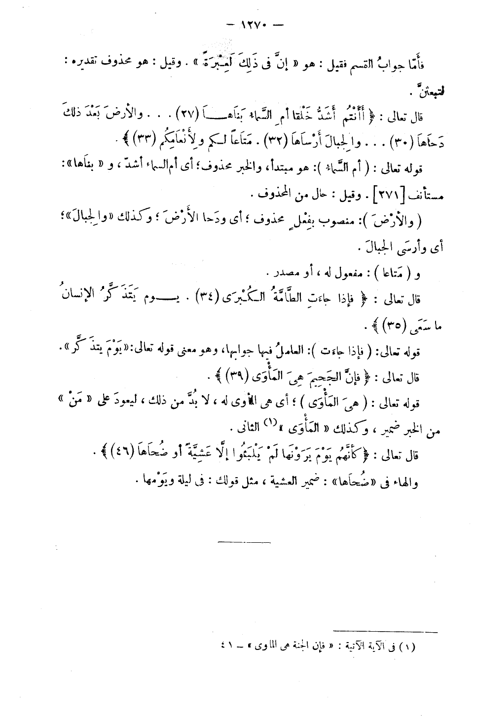 (وَالْأَرْضَ) : مَنْصُوبٌ بِفِعْلٍ مَحْذُوفٍ؛ أَيْ وَدَحَا الْأَرْضَ؛ وَكَذَلِكَ وَ «الْجِبَالَ» أَيْ وَأَرْسَى الْجِبَالَ. وَ (مَتَاعًا) : مَفْعُولٌ لَهُ، أَوْ مَصْدَرٌ.