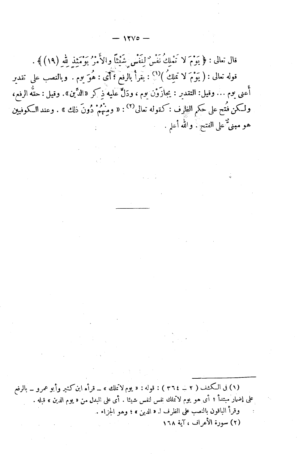 قَوْلُهُ تَعَالَى: (يَوْمَ لَا تَمْلِكُ) : يُقْرَأُ بِالرَّفْعِ؛ أَيْ: هُوَ يَوْمُ. وَبِالنَّصْبِ عَلَى تَقْدِيرٍ أَعَنَى يَوْمَ. . . وَقِيلَ: التَّقْدِيرُ: يُجَازَوْنَ يَوْمَ، وَدَلَّ عَلَيْهِ ذِكْرُ «الدِّينِ» . وَقِيلَ: حَقُّهُ الرَّفْعُ،