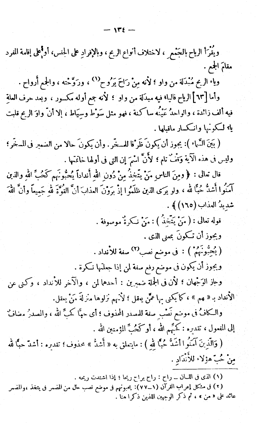 قَوْلُهُ تَعَالَى: (مَنْ يَتَّخِذُ) : مَنْ نَكِرَةٌ مَوْصُوفَةٌ. وَيَجُوزُ أَنْ تَكُونَ بِمَعْنَى الَّذِي. (يُحِبُّونَهُمْ) : فِي مَوْضِعِ نَصْبٍ صِفَةٌ لِلْأَنْدَادِ، وَيَجُوزُ أَنْ يَكُونَ فِي مَوْضِعِ رَفْعٍ صِفَةً لِمَنْ إِذَا جَعَلْتَهَا نَكِرَةً.