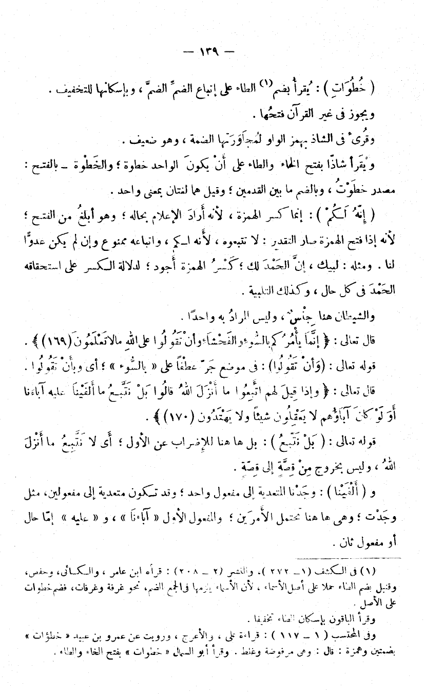 (خُطُوَاتِ) : يُقْرَأُ بِضَمِّ الطَّاءِ عَلَى إِتْبَاعِ الضَّمِّ الضَّمَّ، وَبِإِسْكَانِهَا لِلتَّخْفِيفِ. وَيَجُوزُ فِي غَيْرِ الْقُرْآنِ فَتْحُهَا. وَقُرِئَ فِي الشَّاذِّ بِهَمْزِ الْوَاوِ لِمُجَاوَرَتِهَا الضَّمَّةَ، وَهُوَ ضَعِيفٌ، وَيُقْرَأُ شَاذًّا بِفَتْحِ الْخَاءِ وَالطَّاءِ عَلَى أَنْ يَكُونَ الْوَاحِدُ خَطْوَةً وَالْخَطَوَةُ بِالْفَتْحِ مَصْدَرُ خَطَوَاتٍ، وَبِالضَّمِّ مَا بَيْنَ الْقَدَمَيْنِ، وَقِيلَ: هُمَا لُغَتَانِ بِمَعْنًى وَاحِدٍ.