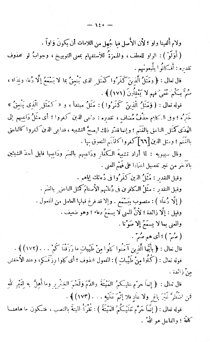 قَوْلُهُ تَعَالَى: (وَمَثَلُ الَّذِينَ كَفَرُوا) : مَثَلُ مُبْتَدَأٌ، وَ (كَمَثَلِ الَّذِي يَنْعِقُ) : خَبَرُهُ. وَفِي الْكَلَامِ حَذْفُ مُضَافٍ ; تَقْدِيرُهُ: دَاعِي الَّذِينَ كَفَرُوا ; أَيْ مَثَلُ دَاعِيهِمْ إِلَى الْهُدَى ; كَمَثَلِ النَّاعِقِ بِالْغَنَمِ ; وَإِنَّمَا قُدِّرَ ذَلِكَ لِيَصِحَّ التَّشْبِيهُ، فَادَّعَى الَّذِينَ كَفَرُوا كَالنَّاعِقِ بِالْغَنَمِ، وَمَثَلُ الَّذِينَ كَفَرُوا كَالْغَنَمِ الْمَنْعُوقِ بِهَا. وَقَالَ سِيبَوَيْهِ: لَمَّا أَرَادَ تَشْبِيهَ الْكُفَّارِ وَدَاعِيهِمْ، بِالْغَنَمِ وَدَاعِيهَا، قَابَلَ أَحَدَ الشَّيْئَيْنِ بِالْآخَرِ مِنْ غَيْرِ تَفْصِيلٍ، اعْتِمَادًا عَلَى فَهْمِ الْمَعْنَى.