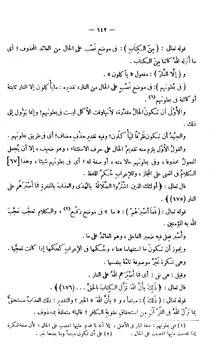 قَوْلُهُ تَعَالَى: (مِنَ الْكِتَابِ) : فِي مَوْضِعِ نَصْبٍ عَلَى الْحَالِ مِنَ الْعَائِدِ الْمَحْذُوفِ ; أَيْ مَا أَنْزَلَهُ اللَّهُ كَائِنًا مِنَ الْكِتَابِ. وَ (إِلَّا النَّارَ) : مَفْعُولُ «يَأْكُلُونَ» . (فِي بُطُونِهِمْ) : فِي مَوْضِعِ نَصْبٍ عَلَى الْحَالِ مِنَ النَّارِ تَقْدِيرُهُ مَا يَأْكُلُونَ إِلَّا النَّارَ ثَابِتَةً أَوْ كَائِنَةً فِي بُطُونِهِمْ، وَالْأَوْلَى أَنْ تَكُونَ الْحَالُ مُقَدَّرَةً ; لِأَنَّهَا وَقْتَ الْأَكْلِ لَيْسَتْ فِي بُطُونِهِمْ، وَإِنَّمَا يَئُولُ إِلَى ذَلِكَ، وَالْجَيِّدُ أَنْ تَكُونَ ظَرْفًا لِيَأْكُلُونِ، وَفِيهِ تَقْدِيرُ حَذْفِ مُضَافٍ ; أَيْ فِي طَرِيقِ بُطُونِهِمْ.