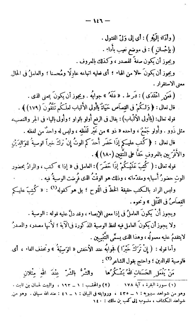 قَوْلُهُ تَعَالَى: (كُتِبَ عَلَيْكُمْ إِذَا حَضَرَ) : الْعَامِلُ فِي إِذَا كُتِبَ وَالْمُرَادُ بِحُضُورِ الْمَوْتِ حُضُورُ أَسْبَابِهِ وَمُقَدِّمَاتِهِ وَذَلِكَ هُوَ الْوَقْتُ الَّذِي فُرِضَتِ الْوَصِيَّةُ فِيهِ، وَلَيْسَ الْمُرَادُ بِالْكُتُبِ حَقِيقَةَ الْخَطِّ فِي اللَّوْحِ بَلْ هُوَ كَقَوْلِهِ «كُتِبَ عَلَيْكُمُ الْقِصَاصُ فِي الْقَتْلَى» وَنَحْوِهِ. وَيَجُوزُ أَنْ يَكُونَ الْعَامِلُ فِي إِذَا مَعْنَى الْإِصَاءِ وَقَدْ دَلَّ عَلَيْهِ قَوْلُهُ الْوَصِيَّةُ.