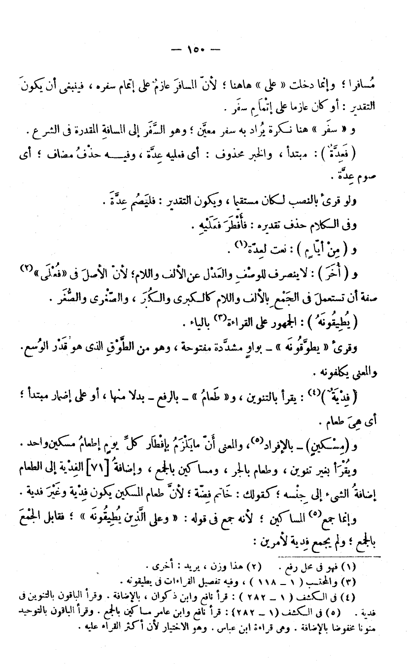 وَفِي الْكَلَامِ حَذْفٌ تَقْدِيرُهُ: فَأَفْطَرَ فَعَلَيْهِ. وَ (مِنْ أَيَّامٍ) : نَعْتٌ لِعِدَّةٍ وَ (أُخَرَ) : لَا يَنْصَرِفُ لِلْوَصْفِ وَالْعَدْلِ عَنِ الْأَلِفِ وَاللَّامِ ; لِأَنَّ الْأَصْلَ فِي فُعْلَى صِفَةً أَنْ تُسْتَعْمَلَ فِي الْجَمْعِ بِالْأَلِفِ وَاللَّامِ، كَالْكُبْرَى وَالْكُبَرِ، وَالصُّغْرَى وَالصُّغَرِ. (يُطِيقُونَهُ) : الْجُمْهُورُ عَلَى الْقِرَاءَةِ بِالْيَاءِ.