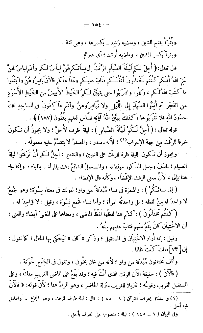 وَيَجُوزُ أَنْ تَكُونَ اللَّيْلَةُ ظَرْفًا لِلرَّفَثِ عَلَى التَّبْيِينِ، وَالتَّقْدِيرُ: أُحِلَّ لَكُمْ أَنْ تَرْفُثُوا لَيْلَةَ الصِّيَامِ فَحَذَفَ وَجَعَلَ الْمَذْكُورَ مُبَيِّنًا لَهُ وَالْمُسْتَعْمَلُ الشَّائِعُ رَفَثَ بِالْمَرْأَةِ بِالْبَاءِ، وَإِنَّمَا جَاءَ هُنَا بِإِلَى ; لِأَنَّ مَعْنَى الرَّفَثِ الْإِفْضَاءُ، وَكَأَنَّهُ قَالَ الْإِفْضَاءَ.