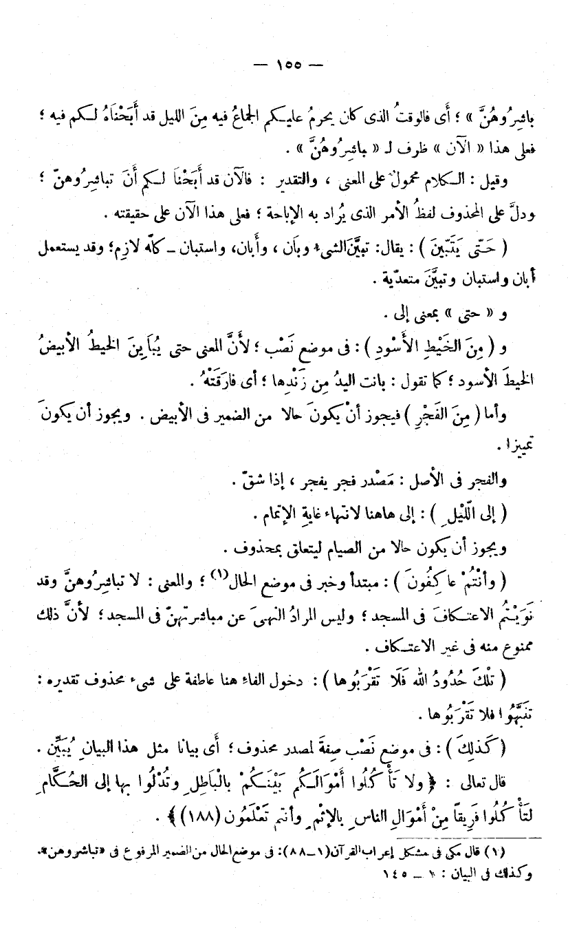 (حَتَّى يَتَبَيَّنَ) : يُقَالُ تَبَيَّنَ الشَّيْءُ وَبَانَ، وَأَبَانَ، وَاسْتَبَانَ، كُلُّهُ لَازِمٌ، وَقَدْ يُسْتَعْمَلُ أَبَانَ وَاسْتَبَانَ وَتَبَيَّنَ مُتَعَدِّيَةً، وَحَتَّى بِمَعْنَى إِلَى. وَ (مِنَ الْخَيْطِ الْأَسْوَدِ) : فِي مَوْضِعِ نَصْبٍ لِأَنَّ الْمَعْنَى حَتَّى يُبَايِنَ الْخَيْطُ الْأَبْيَضُ الْخَيْطَ الْأَسْوَدَ، كَمَا تَقُولُ بَانَتِ الْيَدُ مِنْ زَنْدِهَا ; أَيْ فَارَقَتْهُ.