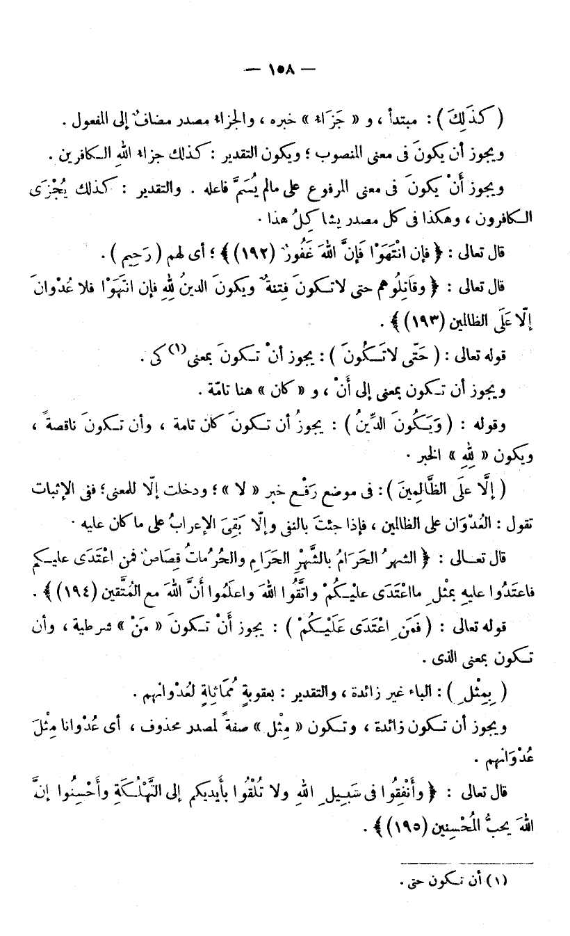 وَيَجُوزُ أَنْ تَكُونَ بِمَعْنَى إِلَى أَنْ، وَكَانَ هُنَا تَامَّةٌ. وَقَوْلُهُ: (وَيَكُونَ الدِّينُ) : يَجُوزُ أَنْ تَكُونَ كَانَ تَامَّةً، وَأَنْ تَكُونَ نَاقِصَةً وَيَكُونُ «لِلَّهِ» الْخَبَرُ. (إِلَّا عَلَى الظَّالِمِينَ) : فِي