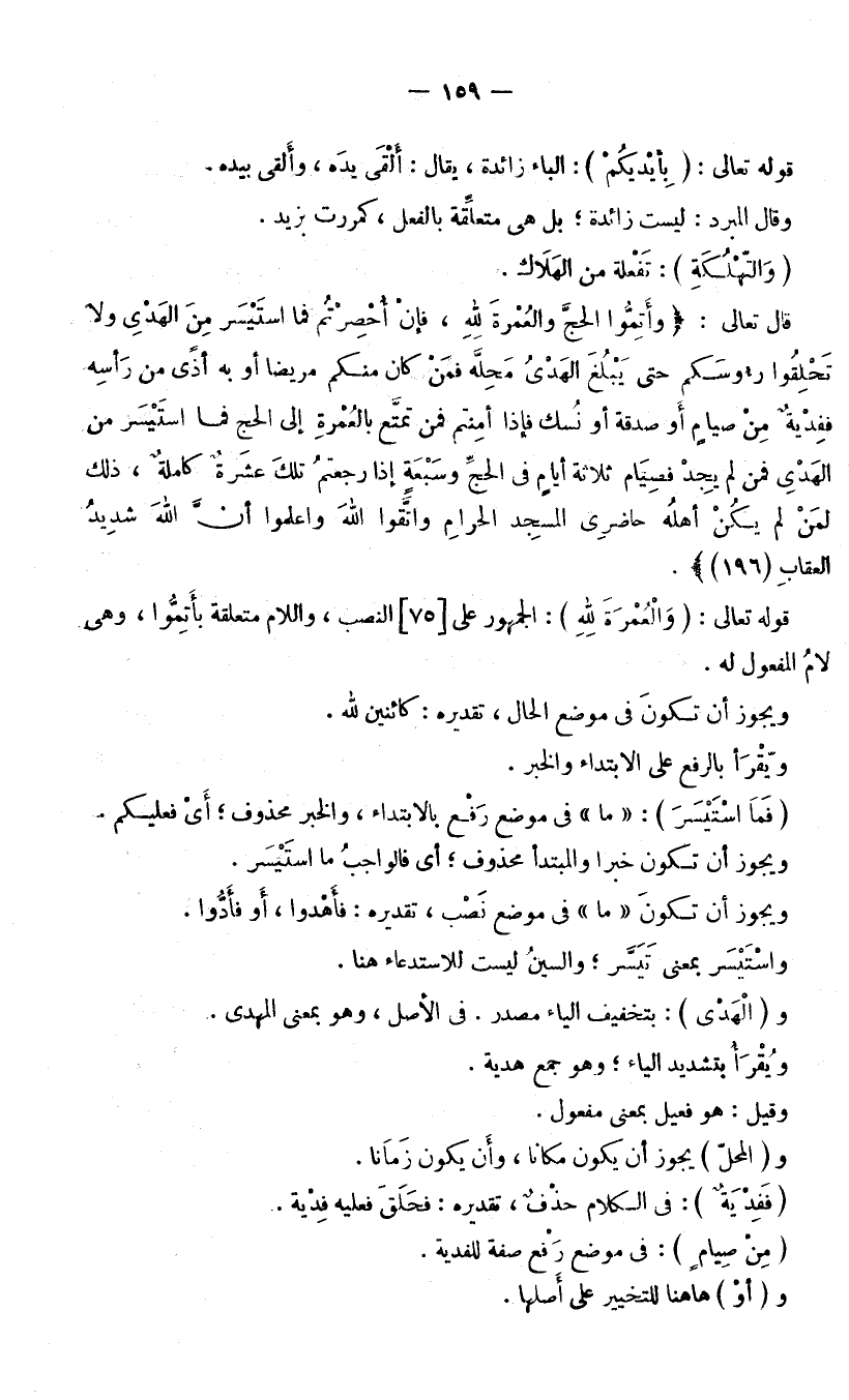 قَوْلُهُ تَعَالَى: (وَالْعُمْرَةَ لِلَّهِ) : الْجُمْهُورُ عَلَى النَّصْبِ، وَاللَّامُ مُتَعَلِّقَةٌ بِأَتِمُّوا، وَهِيَ لَامُ الْمَفْعُولِ لَهُ، وَيَجُوزُ أَنْ تَكُونَ فِي مَوْضِعِ الْحَالِ تَقْدِيرُهُ: كَائِنِينَ لِلَّهِ. وَيُقْرَأُ بِالرَّفْعِ عَلَى الِابْتِدَاءِ وَالْخَبَرِ. (فَمَا اسْتَيْسَرَ) : مَا فِي مَوْضِعِ رَفْعٍ بِالِابْتِدَاءِ، وَالْخَبَرُ مَحْذُوفٌ ; أَيْ فَعَلَيْكُمْ.