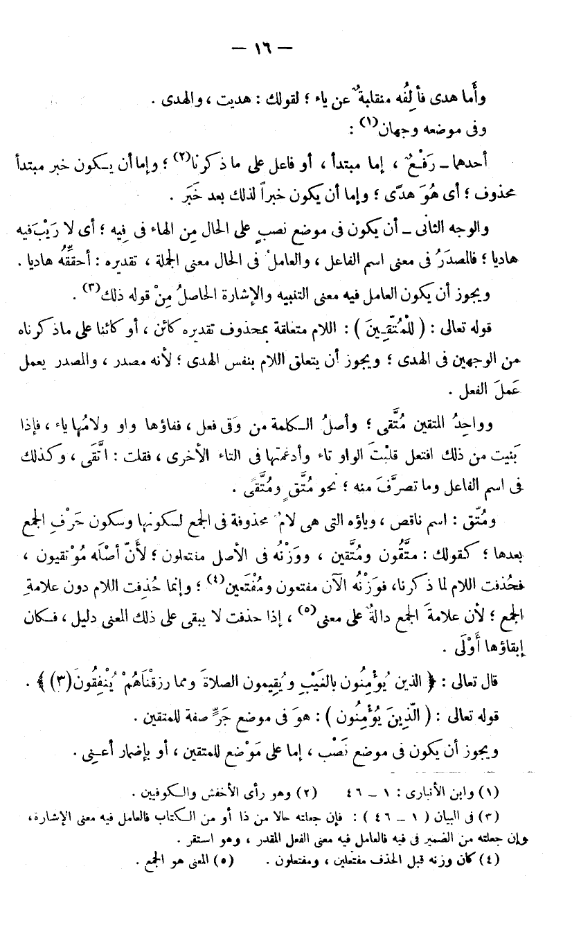 قَوْلُهُ تَعَالَى: (لِلْمُتَّقِينَ) اللَّامُ مُتَعَلِّقَةٌ بِمَحْذُوفٍ تَقْدِيرُهُ: كَائِنٌ أَوْ كَائِنًا عَلَى مَا ذَكَرْنَاهُ مِنَ الْوَجْهَيْنِ فِي الْهُدَى، وَيَجُوزُ أَنْ يَتَعَلَّقَ اللَّامُ بِنَفْسِ الْهُدَى ; لِأَنَّهُ مَصْدَرٌ، وَالْمَصْدَرُ يَعْمَلُ عَمَلَ الْفِعْلِ، وَوَاحِدُ الْمُتَّقِينَ مُتَّقِي، وَأَصْلُ الْكَلِمَةِ مِنْ وَقَى فَعَلَ، فَفَاؤُهَا وَاوٌ، وَلَامُهَا يَاءٌ، فَإِذَا بَنَيْتَ مِنْ ذَلِكَ افْتَعَلَ قَلَبْتَ الْوَاوَ تَاءً، وَأَدْغَمْتَهَا فِي التَّاءِ الْأُخْرَى، فَقُلْتَ: اتَّقَى، وَكَذَلِكَ فِي اسْمِ الْفَاعِلِ وَمَا تَصَرَّفَ مِنْهُ، نَحْوَ مُتَّقٍ وَمُتَّقًى.
