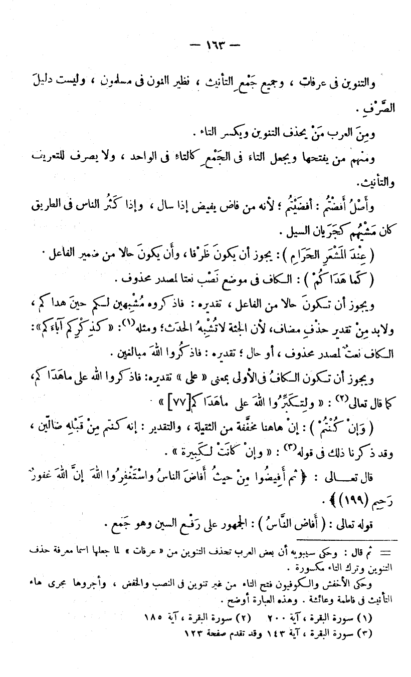 وَالتَّنْوِينُ فِي عَرَفَاتٍ، وَجَمِيعِ جَمْعِ التَّأْنِيثِ نَظِيرُ النُّونِ فِي مُسْلِمُونَ، وَلَيْسَتْ دَلِيلَ الصَّرْفِ، وَمِنَ الْعَرَبِ مَنْ يَحْذِفُ التَّنْوِينَ وَيَكْسِرُ التَّاءَ.