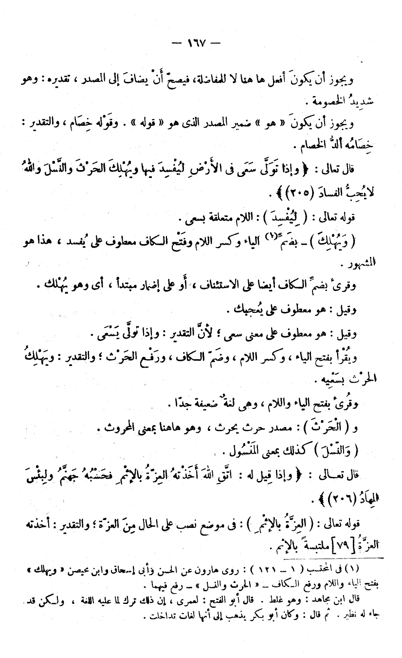 (وَيُهْلِكَ) : بِضَمِّ الْيَاءِ وَكَسْرِ اللَّامِ وَفَتْحِ الْكَافِ مَعْطُوفٌ عَلَى يُفْسِدَ، هَذَا هُوَ الْمَشْهُورُ. وَقُرِئَ بِضَمِّ الْكَافِ أَيْضًا عَلَى الِاسْتِئْنَافِ، أَوْ عَلَى إِضْمَارِ مُبْتَدَأٍ ; أَيْ وَهُوَ يُهْلِكُ.