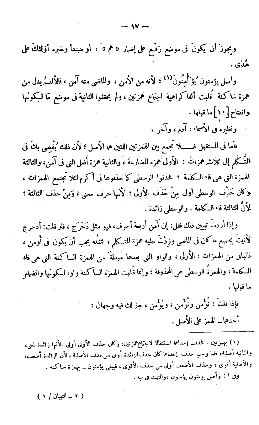 وَإِذَا أَرَدْتَ تَبْيِينَ ذَلِكَ فَقُلْ: إِنَّ آمَنَ أَرْبَعَةُ أَحْرُفٍ، فَهُوَ مِثْلُ دَحْرَجَ، فَلَوْ قُلْتَ: أُدَحْرِجُ لَأَتَيْتَ بِجَمِيعِ مَا كَانَ فِي الْمَاضِي وَزِدْتَ عَلَيْهِ هَمْزَةَ الْمُتَكَلِّمِ، فَمِثْلُهُ يَجِبُ أَنْ يَكُونَ فِي أُومِنُ، فَالْبَاقِي مِنَ الْهَمَزَاتِ: الْأُولَى، وَالْوَاوُ الَّتِي بَعْدَهَا مُبْدَلَةٌ مِنَ الْهَمْزَةِ السَّاكِنَةِ الَّتِي هِيَ فَاءُ الْكَلِمَةِ، وَالْهَمْزَةُ الْوُسْطَى هِيَ الْمَحْذُوفَةُ، وَإِنَّمَا قُلِبَتِ الْهَمْزَةُ السَّاكِنَةُ وَاوًا لِسُكُونِهَا وَانْضِمَامِ مَا قَبْلَهَا، فَإِذَا قُلْتَ " نُؤْمِنُ، وَتُؤْمِنُ، وَيُؤْمِنُ، جَازَ لَكَ فِيهِ وَجْهَانِ: أَحَدُهُمَا: الْهَمْزُ عَلَى الْأَصْلِ.