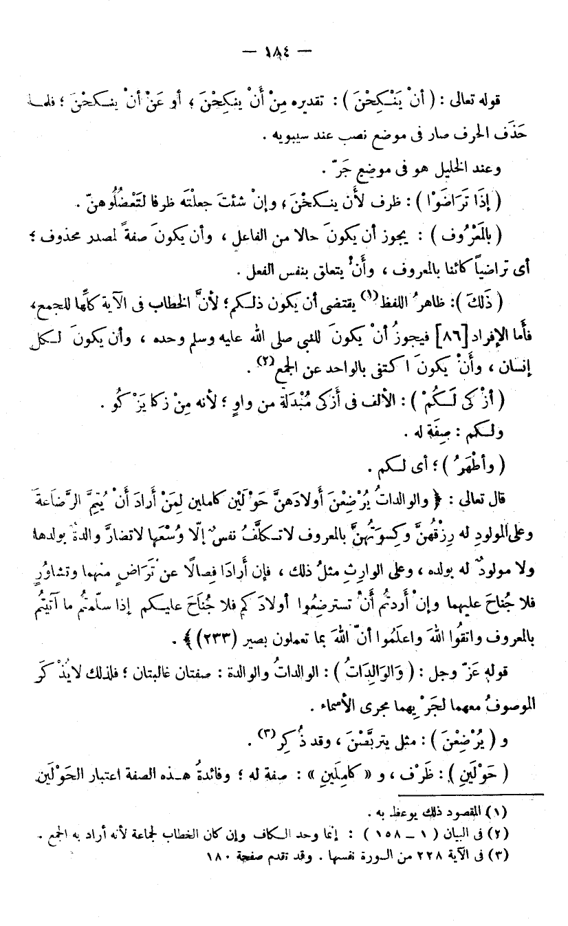 قَوْلُهُ عَزَّ وَجَلَّ: (وَالْوَالِدَاتُ) : الْوَالِدَاتُ وَالْوَالِدَةُ: صِفَتَانِ غَالِبَتَانِ ; فَلِذَلِكَ لَا يُذْكَرُ الْمَوْصُوفُ مَعَهُمَا لِجَرْيِهِمَا مَجْرَى الْأَسْمَاءِ. وَ (يُرْضِعْنَ) : مِثْلُ يَتَرَبَّصْنَ، وَقَدْ ذُكِرَ (حَوْلَيْنِ) : ظَرْفٌ، وَ (كَامِلَيْنِ) صِفَةٌ لَهُ ; وَفَائِدَةُ هَذِهِ الصِّفَةِ اعْتِبَارُ الْحَوْلَيْنِ