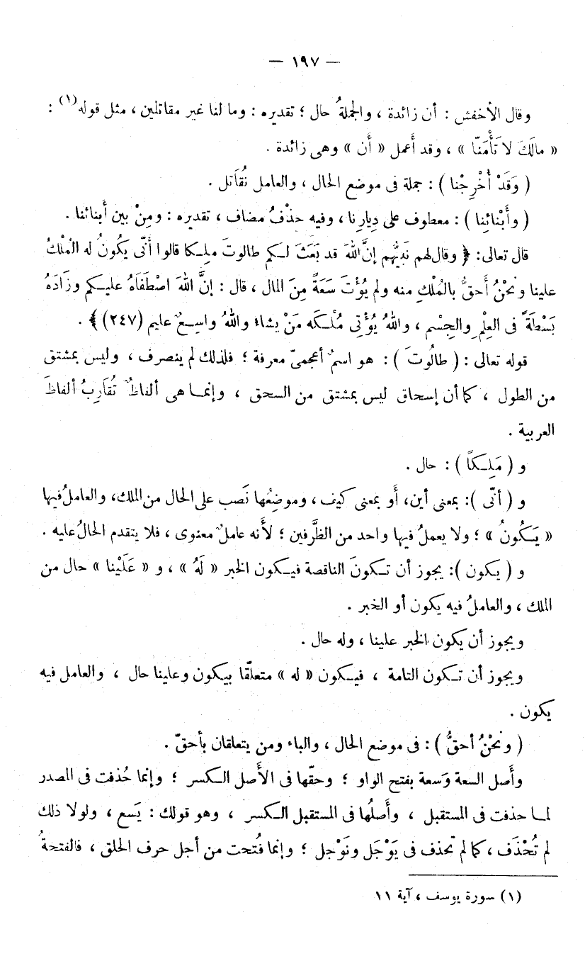 وَ «عَلَيْنَا» حَالٌ مِنَ الْمَلِكِ، وَالْعَامِلُ فِيهِ يَكُونُ أَوِ الْخَبَرُ. وَيَجُوزُ أَنْ يَكُونَ الْخَبَرُ عَلَيْنَا، وَلَهُ حَالٌ. وَيَجُوزُ أَنْ تَكُونَ التَّامَّةَ، فَيَكُونُ لَهُ مُتَعَلِّقًا بِيَكُونُ، وَعَلَيْنَا حَالٌ، وَالْعَامِلُ فِيهِ يَكُونُ.