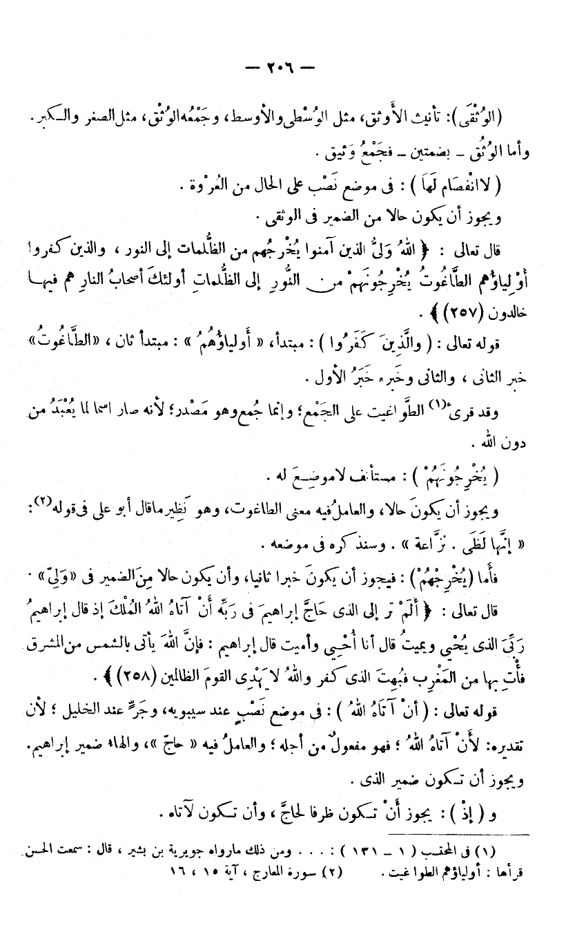 وَقَدْ قُرِئَ الطَّوَاغِيتُ عَلَى الْجَمْعِ، وَإِنَّمَا جُمِعَ، وَهُوَ مَصْدَرٌ ; لِأَنَّهُ صَارَ اسْمًا لِمَا يُعْبَدُ مِنْ دُونِ اللَّهِ. (يُخْرِجُونَهُمْ) : مُسْتَأْنَفٌ لَا مَوْضِعَ لَهَا.