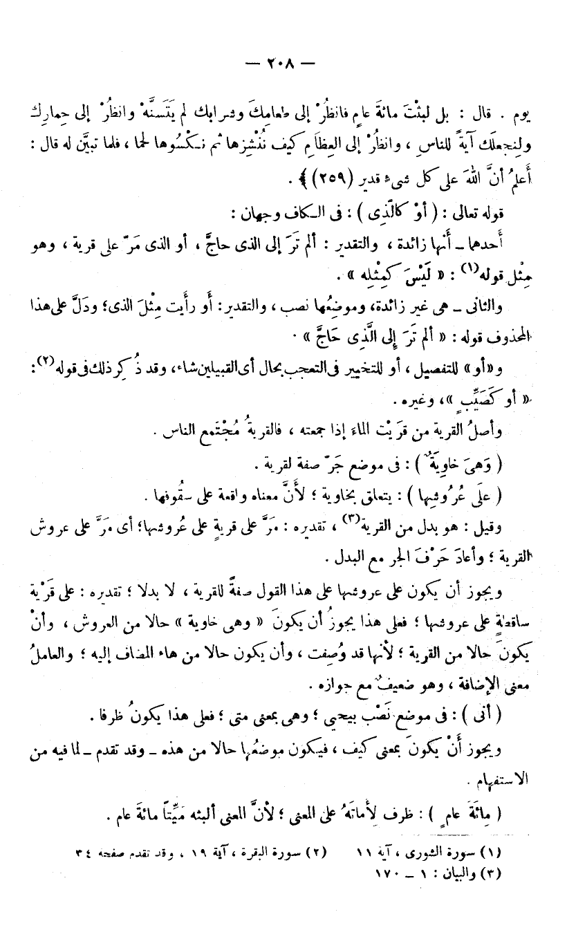 قَوْلُهُ تَعَالَى: (أَوْ كَالَّذِي) : فِي الْكَافِ وَجْهَانِ: أَحَدُهُمَا: أَنَّهَا زَائِدَةٌ، وَالتَّقْدِيرُ: أَلَمْ تَرَ إِلَى الَّذِي حَاجَّ، أَوِ الَّذِي مَرَّ عَلَى قَرْيَةٍ، وَهُوَ مِثْلُ قَوْلِهِ: (لَيْسَ كَمِثْلِهِ) [الشُّورَى: 11] .