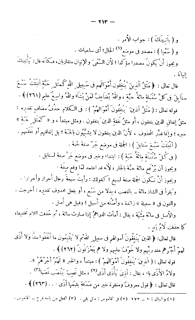 قَوْلُهُ تَعَالَى: (مَثَلُ الَّذِينَ يُنْفِقُونَ أَمْوَالَهُمْ) : فِي الْكَلَامِ حَذْفُ مُضَافٍ تَقْدِيرُهُ: مَثَلُ