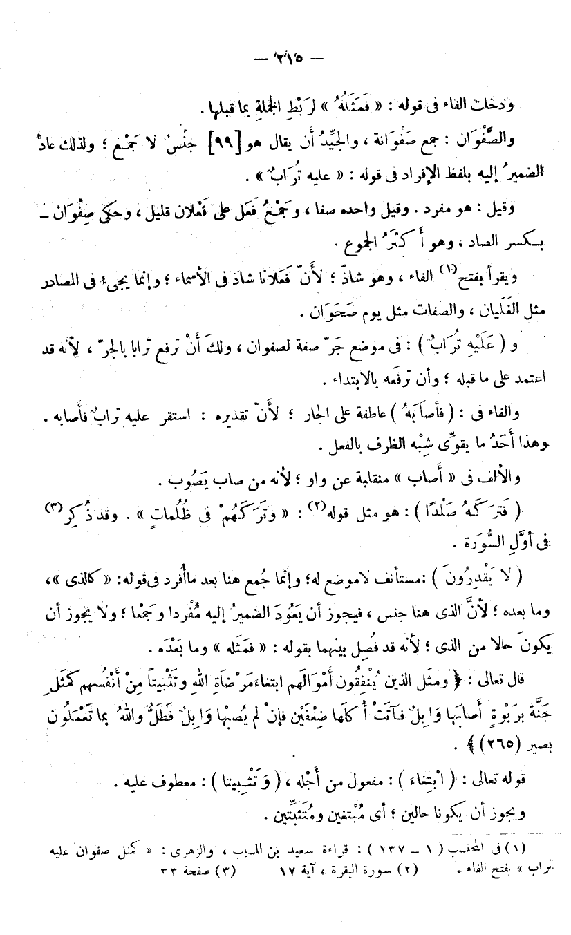 وَقِيلَ: هُوَ مُفْرَدٌ. وَقِيلَ: وَاحِدُهُ صَفَا، وَجَمْعُ فَعَلَ عَلَى فِعْلَانٍ قَلِيلٌ، وَحُكِيَ صِفْوَانٌ بِكَسْرِ الصَّادِ، وَهُوَ أَكْثَرُ الْجُمُوعِ، وَيُقْرَأُ بِفَتْحِ الْفَاءِ وَهُوَ شَاذٌّ ; لِأَنَّ فَعْلَانًا شَاذٌّ فِي الْأَسْمَاءِ، وَإِنَّمَا يَجِيءُ فِي الْمَصَادِرِ مِثْلُ الْغَلَيَانِ، وَالصِّفَاتِ مِثْلُ يَوْمٍ صَحَوَانٍ. وَ (عَلَيْهِ تُرَابٌ) : فِي مَوْضِعِ جَرٍّ صِفَةٌ لِصَفْوَانٍ، وَلَكَ أَنْ تَرْفَعَ تُرَابًا بِالْجَرِّ ; لِأَنَّهُ قَدِ اعْتَمَدَ عَلَى مَا قَبْلَهُ، وَأَنْ تَرْفَعَهُ بِالِابْتِدَاءِ.