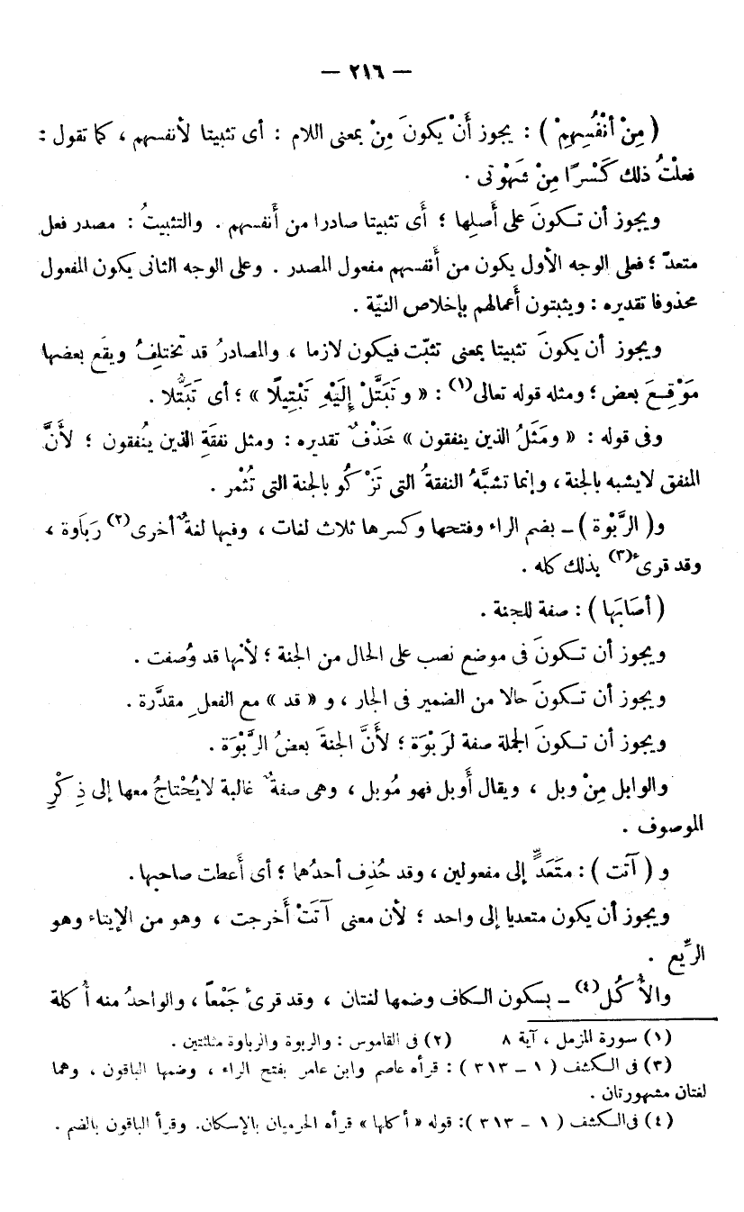 (مِنْ أَنْفُسِهِمْ) : يَجُوزُ أَنْ يَكُونَ مِنْ بِمَعْنَى اللَّامِ ; أَيْ تَثْبِيتًا لِأَنْفُسِهِمْ، كَمَا تَقُولُ فَعَلْتُ ذَلِكَ كَسْرًا فِي شَهْوَتِي. وَيَجُوزُ أَنْ تَكُونَ عَلَى أَصْلِهَا ; أَيْ تَثْبِيتًا صَادِرًا مِنْ أَنْفُسِهِمْ، وَالتَّثْبِيتُ مَصْدَرُ فِعْلٍ مُتَعَدٍّ ; فَعَلَى الْوَجْهِ الْأَوَّلِ يَكُونُ مِنْ أَنْفُسِهِمْ مَفْعُولُ الْمَصْدَرِ، وَعَلَى الْوَجْهِ الثَّانِي يَكُونُ الْمَفْعُولُ مَحْذُوفًا تَقْدِيرُهُ: وَيُثْبِتُونَ أَعْمَالَهُمْ بِإِخْلَاصِ النِّيَّةِ.