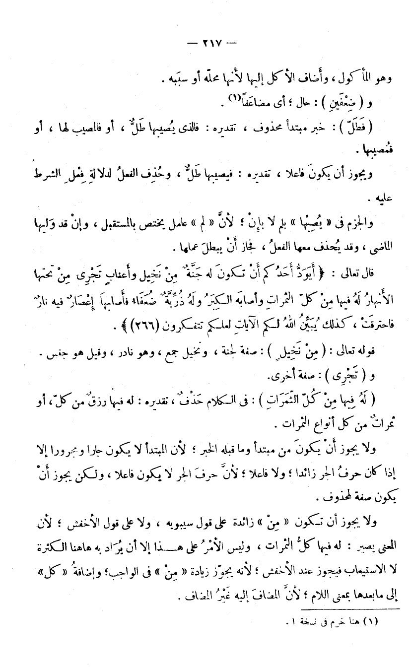 وَلَا يَجُوزُ أَنْ تَكُونَ (مِنْ) زَائِدَةً عَلَى قَوْلِ سِيبَوَيْهِ، وَلَا عَلَى قَوْلِ الْأَخْفَشِ ; لِأَنَّ الْمَعْنَى يَصِيرُ لَهُ فِيهَا كُلُّ الثَّمَرَاتِ، وَلَيْسَ الْأَمْرُ عَلَى هَذَا إِلَّا أَنْ يُرَادَ بِهِ هَاهُنَا الْكَثْرَةَ لَا الِاسْتِيعَابَ فَيَجُوزُ عِنْدَ الْأَخْفَشِ ; لِأَنَّهُ يَجُوزُ زِيَادَةُ (مِنْ) فِي الْوَاجِبِ، وَإِضَافَةُ (كُلٍّ) إِلَى مَا بَعْدَهَا بِمَعْنَى اللَّامِ ; لِأَنَّ الْمُضَافَ إِلَيْهِ غَيْرُ الْمُضَافِ.