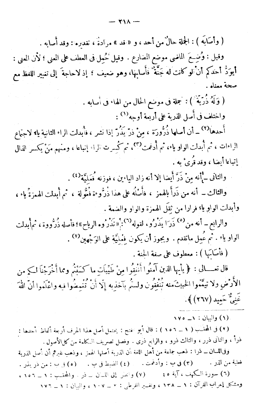 وَقِيلَ: وُضِعَ الْمَاضِي مَوْضِعَ الْمُضَارِعِ، وَقِيلَ: حُمِلَ فِي الْعَطْفِ عَلَى الْمَعْنَى ; لِأَنَّ الْمَعْنَى أَيَوَدُّ أَحَدُكُمْ أَنْ لَوْ كَانَتْ لَهُ جَنَّةٌ فَأَصَابَهَا، وَهُوَ ضَعِيفٌ، إِذْ لَا حَاجَةَ إِلَى تَغْيِيرِ اللَّفْظِ مَعَ صِحَّةِ مَعْنَاهُ. (وَلَهُ ذُرِّيَّةٌ) : جُمْلَةٌ فِي مَوْضِعِ الْحَالِ مِنَ الْهَاءِ فِي أَصَابَهُ.