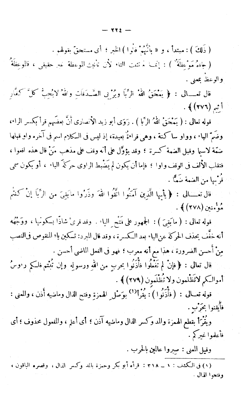 قَوْلُهُ تَعَالَى: (فَأْذَنُوا) : يُقْرَأُ بِوَصْلِ الْهَمْزَةِ وَفَتْحِ الذَّالِ، وَمَاضِيهِ أَذِنَ، وَالْمَعْنَى: فَأَيْقِنُوا بِحَرْبٍ. وَيُقْرَأُ بِقَطْعِ الْهَمْزَةِ وَالْمَدِّ وَكَسْرِ الذَّالِ وَمَاضِيهِ آذِنْ ; أَيْ أَعْلِمْ، وَالْمَفْعُولُ مَحْذُوفٌ ; أَيْ فَأَعْلِمُوا غَيْرَكُمْ. وَقِيلَ: الْمَعْنَى صِيرُوا عَالِمِينَ بِالْحَرْبِ.