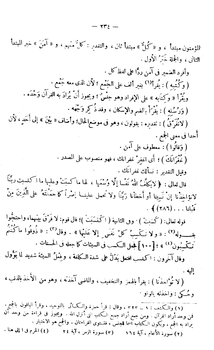 الْمُؤْمِنُونَ مُبْتَدَأٌ، وَ «كُلٌّ» مُبْتَدَأٌ ثَانٍ، وَالتَّقْدِيرُ: كُلٌّ مِنْهُمْ وَ: «آمَنَ» خَبَرُ الْمُبْتَدَأِ الثَّانِي، وَالْجُمْلَةُ خَبَرُ الْأَوَّلِ، وَأَفْرَدَ الضَّمِيرَ فِي آمَنَ رَدًّا عَلَى لَفْظِ كُلٍّ.