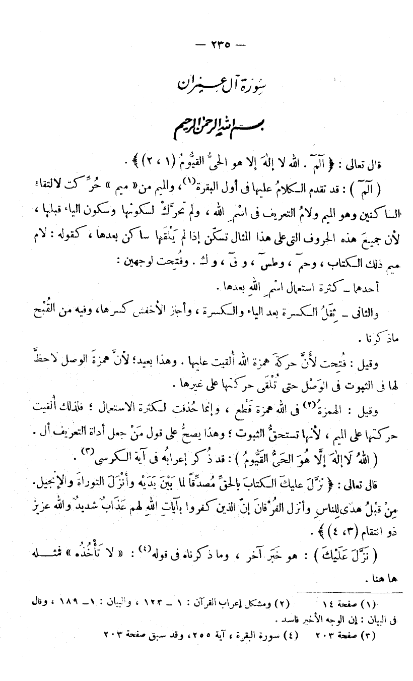 (الم) : قَدْ تَقَدَّمَ الْكَلَامُ عَلَيْهَا فِي أَوَّلِ الْبَقَرَةِ، وَالْمِيمُ مِنْ «مِيمٍ» حُرِّكَتْ لِالْتِقَاءِ السَّاكِنَيْنِ وَهُوَ الْمِيمُ وَلَامُ التَّعْرِيفِ فِي اسْمِ اللَّهِ، وَلَمْ تُحَرَّكْ لِسُكُونِهَا وَسُكُونِ الْيَاءِ قَبْلَهَا، لِأَنَّ جَمِيعَ هَذِهِ الْحُرُوفِ الَّتِي عَلَى هَذَا الْمِثَالِ تَسْكُنُ إِذَا لَمْ يَلْقَهَا سَاكِنٌ بَعْدَهَا، كَقَوْلِهِ لَامْ مِيمْ ذَلِكَ الْكِتَابُ، وَ «حم» ، وَ «طس» ، وَ «ق» ، وَ «ك» . وَفُتِحَتْ لِوَجْهَيْنِ: أَحَدُهُمَا: كَثْرَةُ اسْتِعْمَالِ اسْمِ اللَّهِ بَعْدَهَا. وَالثَّانِي: ثِقَلُ الْكَسْرَةِ بَعْدَ الْيَاءِ وَالْكَسْرَةِ، وَأَجَازَ الْأَخْفَشُ كَسْرَهَا، وَفِيهِ مِنَ الْقُبْحِ مَا ذَكَرْنَا.