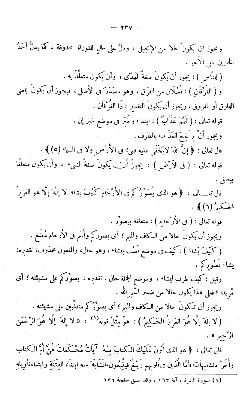 وَيَجُوزُ أَنْ يَكُونَ حَالًا مِنَ الْإِنْجِيلِ، وَدَلَّ عَلَى حَالٌ لِلتَّوْرَاةِ مَحْذُوفَةٌ، كَمَا يَدُلُّ أَحَدُ الْخَبَرَيْنِ عَلَى الْآخَرِ. وَ (لِلنَّاسِ) : يَجُوزُ أَنْ يَكُونَ صِفَةً لِهُدًى، وَأَنْ يَكُونَ مُتَعَلِّقًا بِهِ.