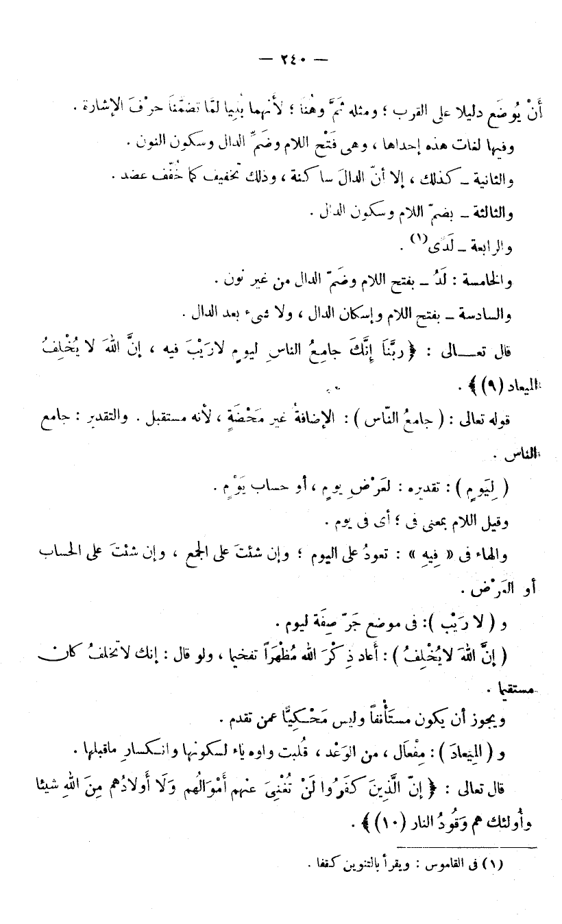 وَقِيلَ: اللَّامُ بِمَعْنَى فِي ; أَيْ فِي يَوْمٍ. وَالْهَاءُ فِي «فِيهِ» تَعُودُ عَلَى الْيَوْمِ ; وَإِنْ شِئْتَ عَلَى الْجَمْعِ، وَإِنْ شِئْتَ عَلَى الْحِسَابِ أَوِ الْعَرْضِ. وَ (لَا رَيْبَ) : فِي مَوْضِعِ جَرٍّ صِفَةٌ لِيَوْمٍ. (إِنَّ اللَّهَ لَا يُخْلِفُ) : أَعَادَ ذِكْرَ اللَّهِ مُظْهَرًا تَفْخِيمًا، وَلَوْ قَالَ إِنَّكَ لَا تُخْلِفُ كَانَ مُسْتَقِيمًا. وَيَجُوزُ أَنْ يَكُونَ مُسْتَأْنَفًا، وَلَيْسَ مَحْكِيًّا عَمَّنْ تَقَدَّمَ.