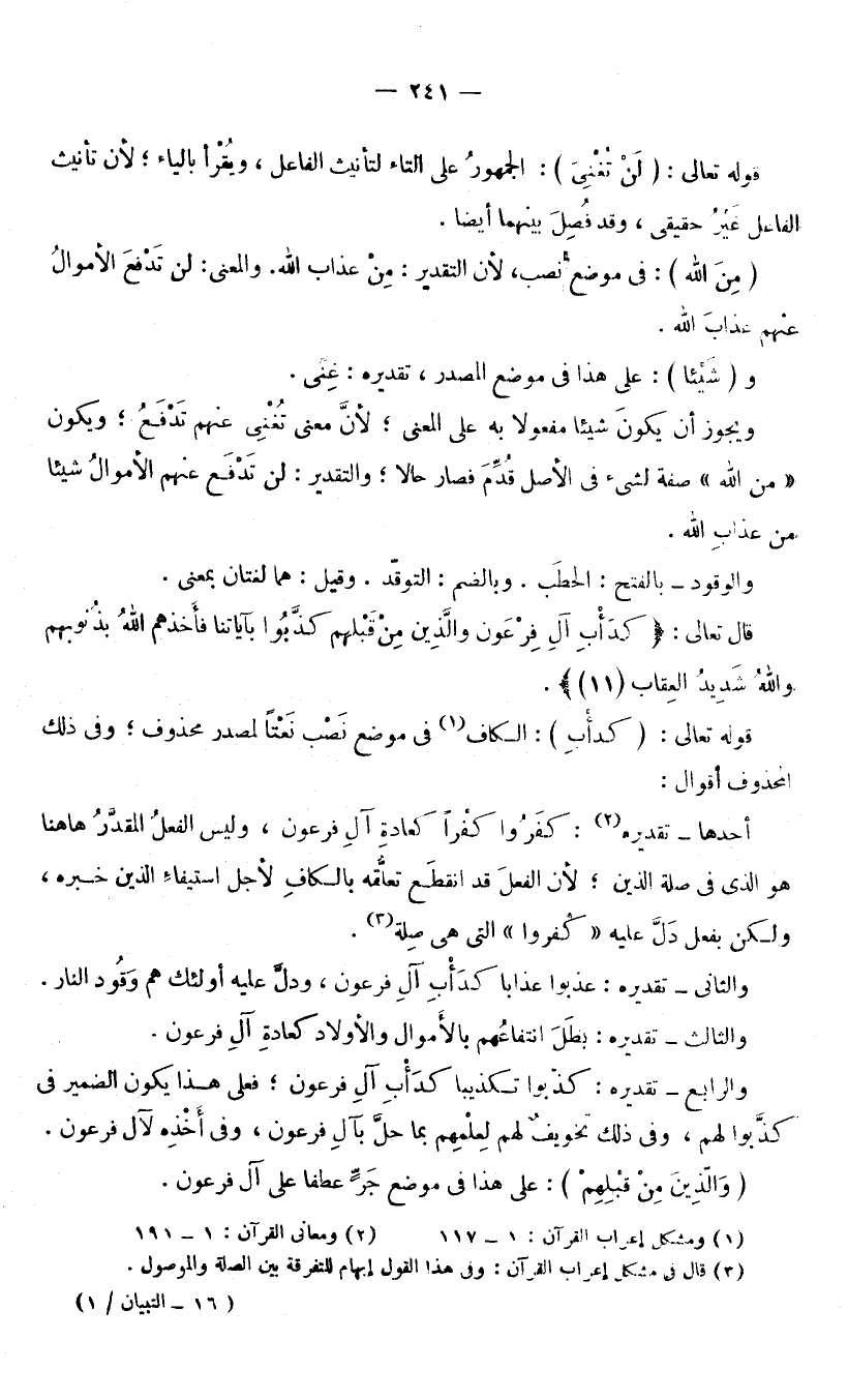 أَحَدُهَا تَقْدِيرُهُ: كَفَرُوا كُفْرًا كَعَادَةِ آلِ فِرْعَوْنَ، وَلَيْسَ الْفِعْلُ الْمُقَدَّرُ هَاهُنَا هُوَ الَّذِي فِي صِلَةِ الَّذِينَ ; لِأَنَّ الْفِعْلَ قَدِ انْقَطَعَ تَعَلُّقُهُ بِالْكَافِ ; لِأَجْلِ اسْتِيفَاءِ الَّذِينَ خَبَرَهُ، وَلَكِنْ بِفِعْلٍ دَلَّ عَلَيْهِ «كَفَرُوا» الَّتِي هِيَ صِلَةٌ.