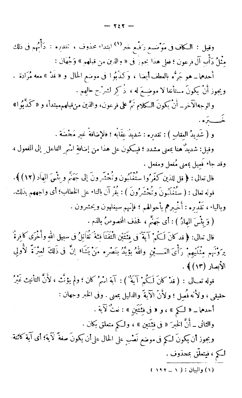 قَوْلُهُ تَعَالَى: (قَدْ كَانَ لَكُمْ آيَةٌ) : آيَةٌ اسْمُ كَانَ ; وَلَمْ يُؤَنَّثْ، لِأَنَّ التَّأْنِيثَ غَيْرُ حَقِيقِيٍّ، وَلِأَنَّهُ فُصِلَ ; وَلِأَنَّ الْآيَةَ وَالدَّلِيلَ بِمَعْنًى. وَفِي الْخَبَرِ وَجْهَانِ: أَحَدُهُمَا: «لَكُمْ» وَ «فِئَتَيْنِ» نَعْتٌ لِآيَةٍ.